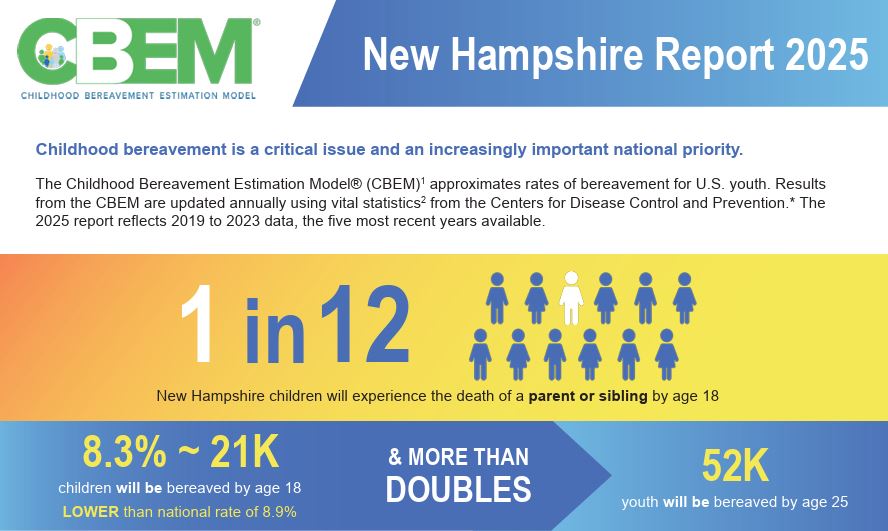 Childhood grief has profound impacts on youth, families, and communities. In partnership with the New York Life Foundation, we developed the Childhood Bereavement Estimation Model (CBEM) to understand the magnitude of the issue. The CBEM approximates rates of U.S. children and youth who will experience the death of a parent or sibling by the time they reach adulthood.